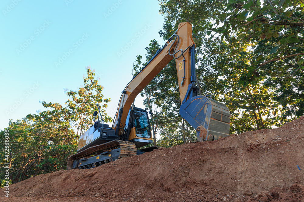 Excavators are digging the soil in the construction site with the tree and outdoor background