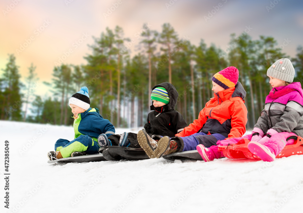 childhood, sledging and season concept - group of happy little children sliding on sleds in winter over snowy forest or park background