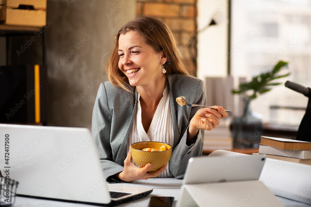 Businesswoman in office having healthy snack. Young woman eating fruit while having a video call.