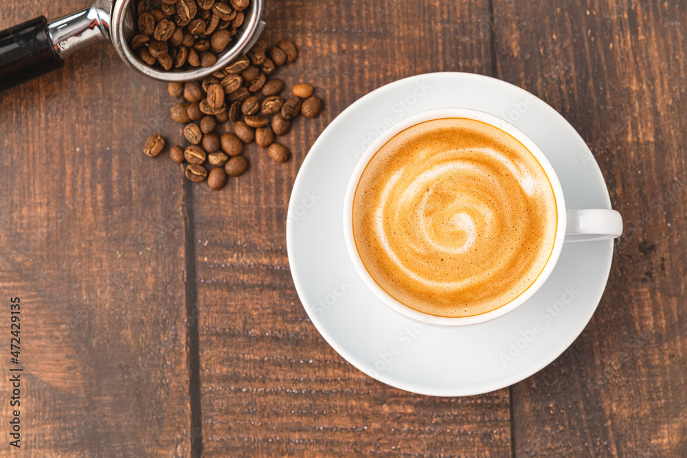 Fresh cappuccino coffee together decorated with coffee beans on wooden table