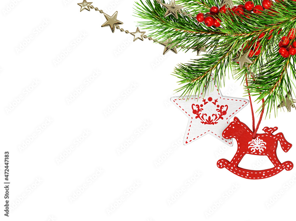 Christmas corner arrangement with green pine twigs, red and white painted wooden decorations and red berries isolated on white