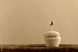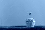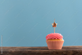 Festive muffin frosted with pink buttercream frosting with candle on pink background. Copy space.