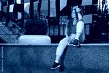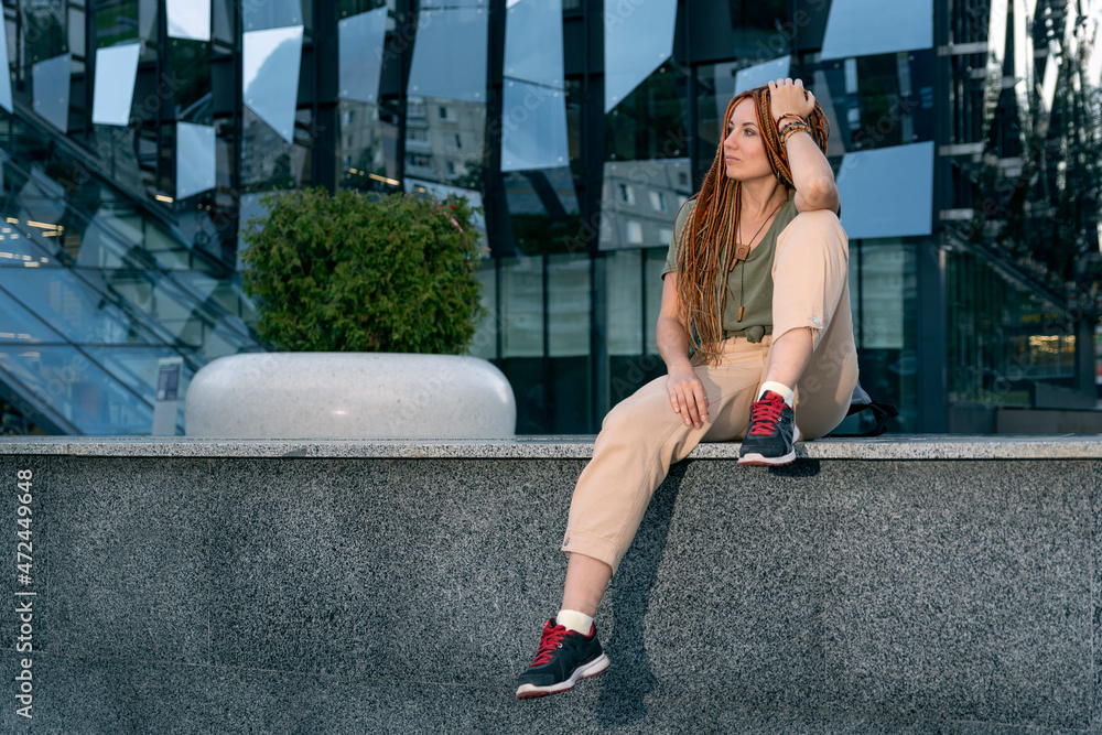 Girl sits on the parapet hanging her leg down. Against the background of an office building.Non-standard office employee