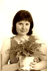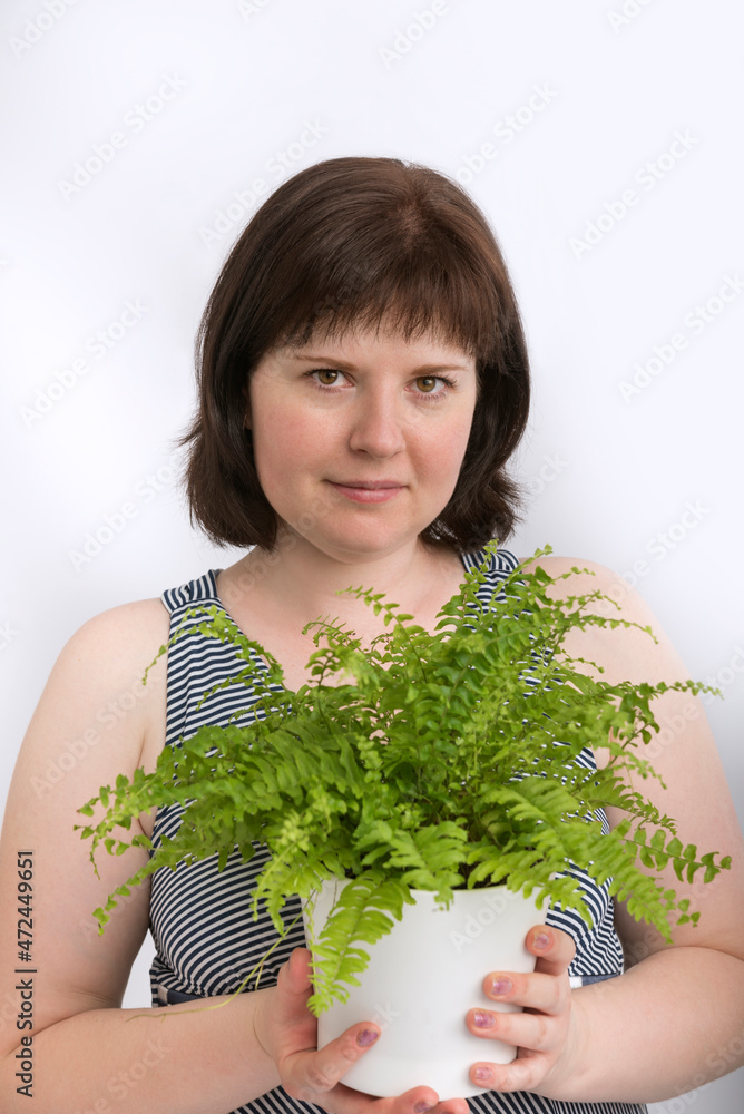 Portrait of round-faced dark-haired woman with houseplant in her hands on white background.