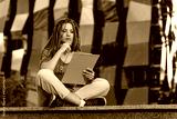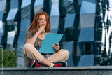 Beautiful girl with red dreadlocks thoughtfully looks at the tablet. Girl learns the script of the film. Acting skills.