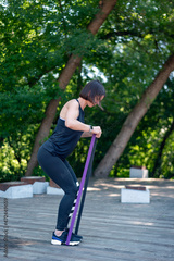Woman during her fitness workout at the park with rubber resistance band. Sporty woman exercising with resistance band.