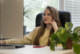 Young woman in glasses works at the computer. Secretary prepares a presentation. Office worker