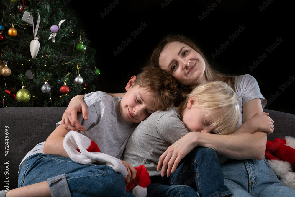 Young mother and two sons are relaxing on the sofa on Christmas Eve.