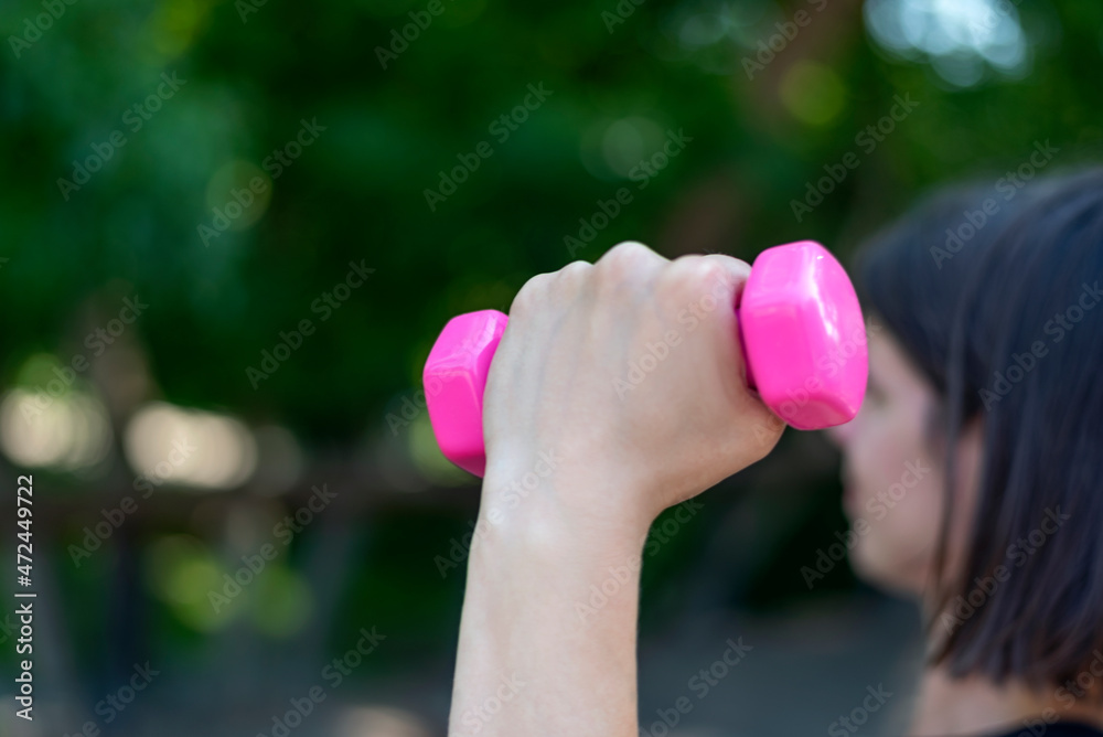 Pink dumbbell in womans hand. Outdoor fitness. Equipment for sports. Close up.