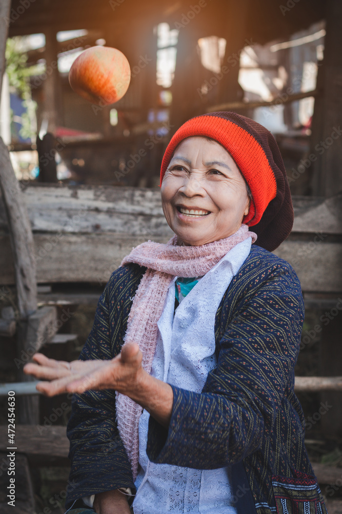 Asian old woman throwing apple in the air with smile and happy.Concept of Healthy Food for Seniors