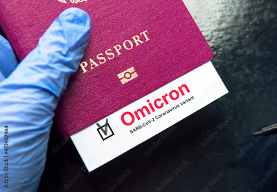 Omicron COVID-19 variant and travel concept, test positive result note in passport