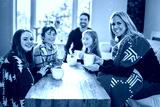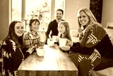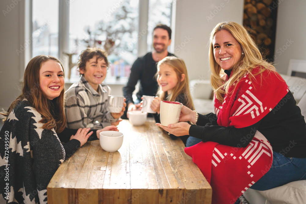 Family Enjoying Hot Drink In Cafe at home close to fireplace