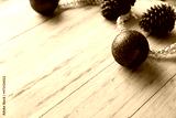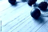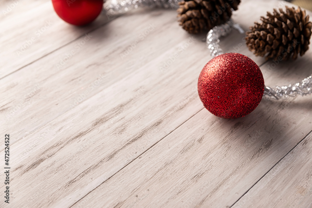 Pine cones and red christmas balls for christmas decoration on rustic white wooden background. Copy space for your text