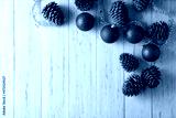 Pine cones and red christmas balls for christmas decoration on rustic white wooden background. Top view. Copy space for your text