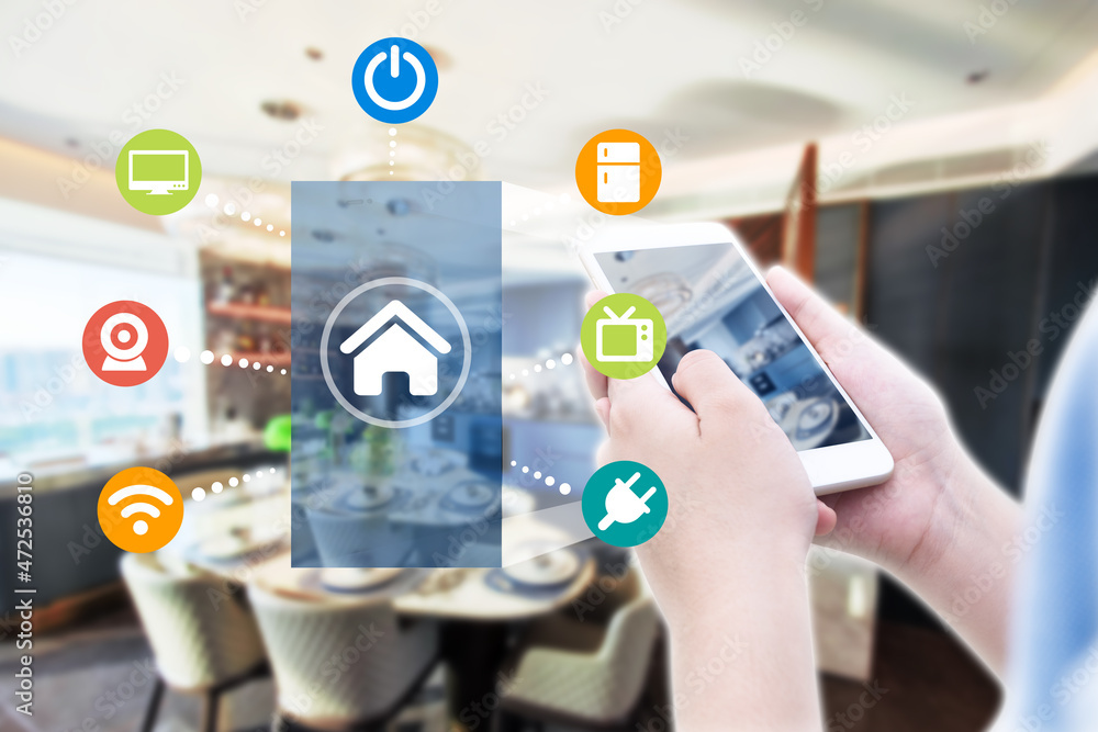 Smart home automation app on mobile with home interior in background. Internet of things concept at home.