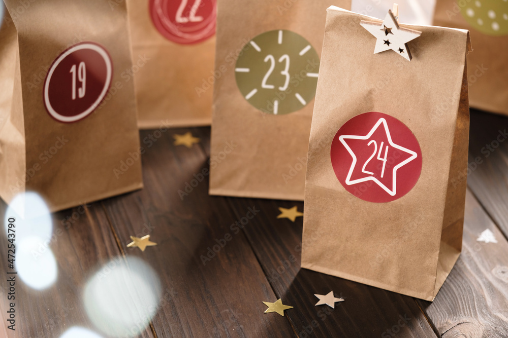 Christmas advent calendar for kids, creative tasks in paper bags for everyday. 24 handmade numbered bags with gifts. Countdown to Christmas Eve. Close-up