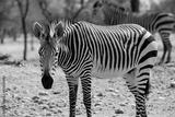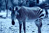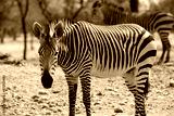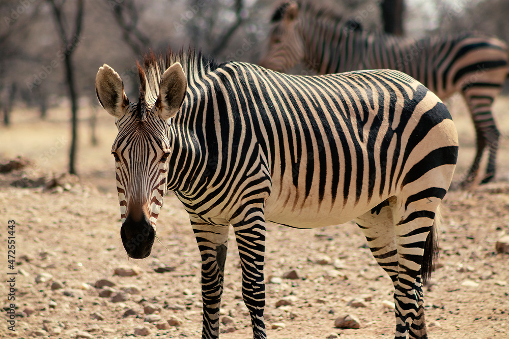 Wild african life. Two Namibian zebras standing in the middle of the savannah.