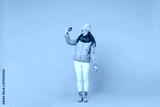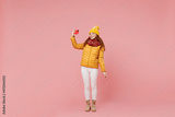 Full size body length young woman 20s wear yellow jacket hat mittens doing selfie shot on mobile cell phone post photo on social network isolated on plain pastel light pink background studio portrait