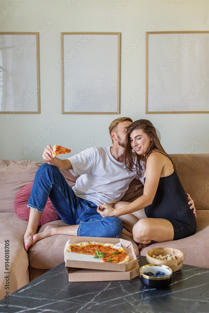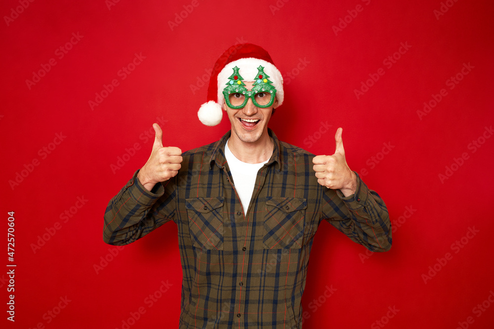 concept people, body language, approval, recommendation. an excited man in masquerade glasses Christmas trees Santa Claus hat shows raised thumbs isolated on red studio background with space for text