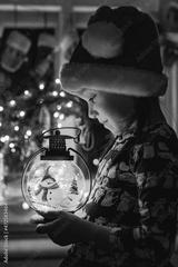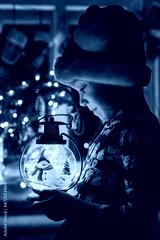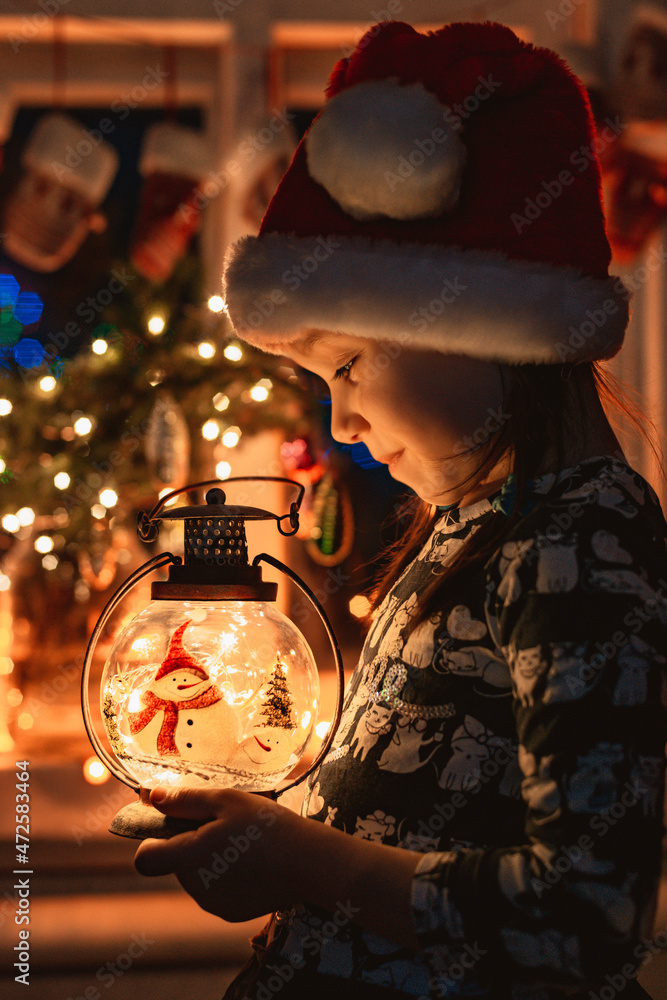little girl looks at a Christmas lantern illuminating the face in Santa's hat at night in the room,