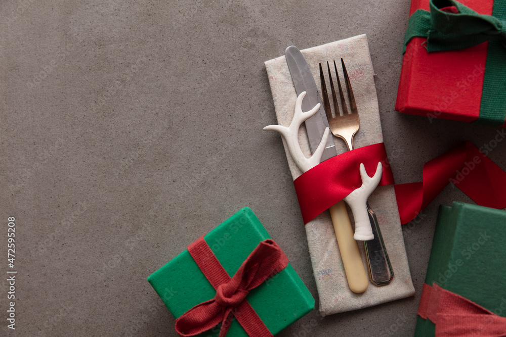 Christmas day table setting with cutlery wrapped in a red ribbon and gift box presents