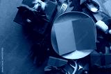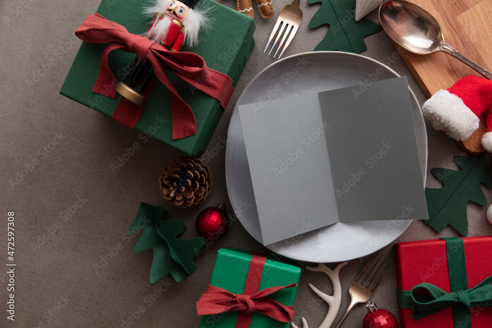 Christmas meal blank menu. Blank paper menu on a dinner plate surrounded by festive decorations