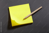 Yellow sticker block note on blackboard and pencil