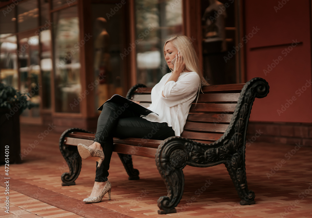 A confident businesswoman sitting on the bench working over the project and talking on the phone with clients