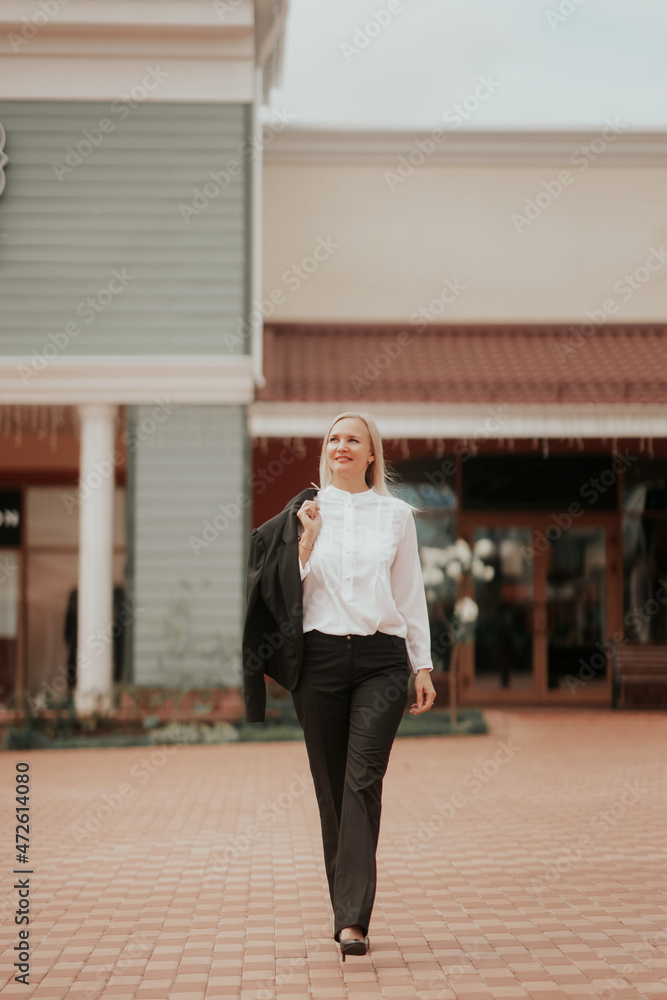 A confident smiling businesswoman in a white shirt and business suit walking along the street