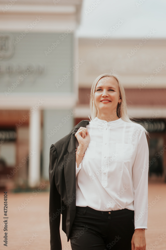 A confident smiling businesswoman in a white shirt and business suit walking along the street