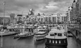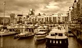 Luxury residential buildings and vintage sailing ships moored at St Katherine Dock, London.