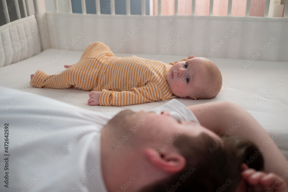 Tired father sleeping and his newborn son lying on bed looking at camera at home.