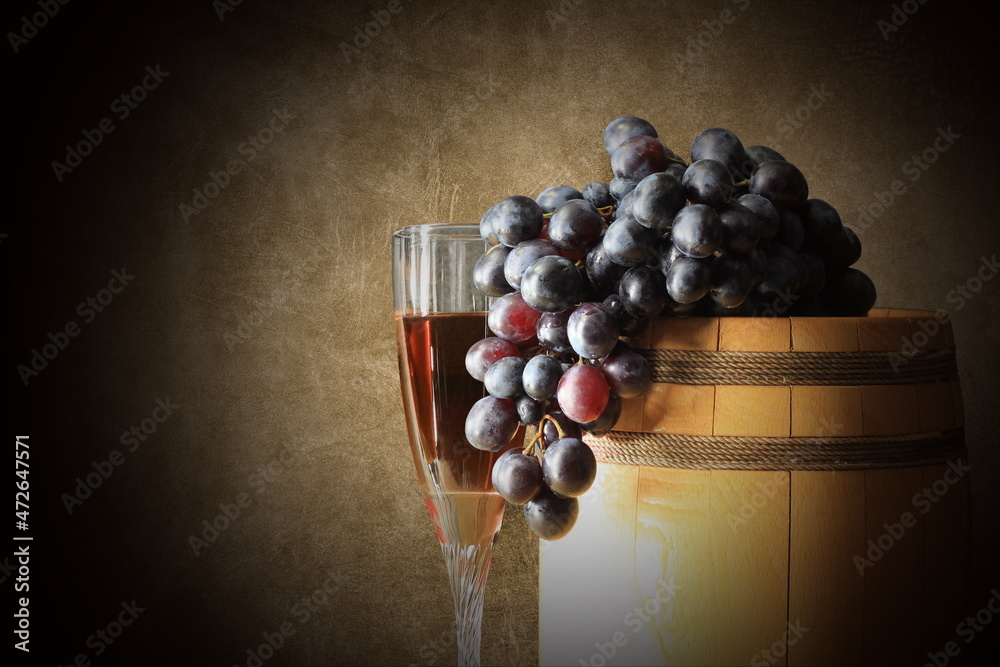 Beautiful still life with glass of red wine against background of oak wine barrel with red wine and next to bunch of grapes for making red wine