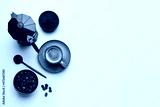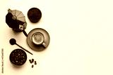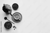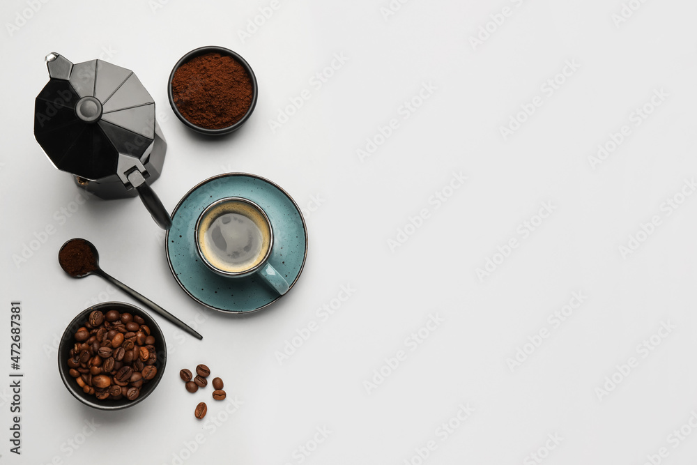 Flat lay composition with coffee grounds and roasted beans on white background, space for text
