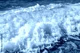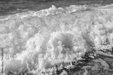 Shining waves splash close-up with white foam hitting pebble beach. Clear blue water on Island in Greece. Summer travel to Ionian Sea