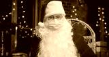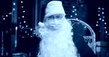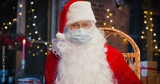 Joyful man Santa Claus wearing protective mask looking at the camera while sitting at home. Close up of happy senior man in Santa Clause costume. Christmas spirit concept