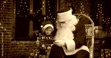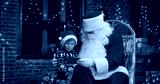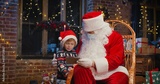 Little caucasian boy using smartphone with Santa Claus wearing protective mask while spending time at home with New Year decorations. Pandemic concept