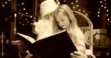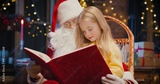 Happy child girl hugging Santa and reading book with interest. Happy child spending time with Santa Clause. Holidays concept