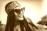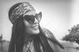 Matte, retro style, close-up portrait of a cool, artsy, bohemian woman with long straight black hair, vintage bandanna, beaded jewelry, face glitter and large heart shaped sunglasses.