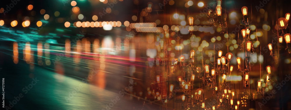 city lamp light of party and street motion for Christmas of vintage pub in dark city night abstract banner background