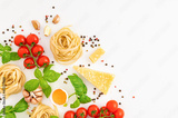 Iettuccine with ingredients for cooking Italian pasta on white background, top view