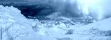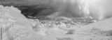 Panoramic landscape of a snowy forest in the mountains on a sunny winter day. Ukrainian Carpathians, near Mount Petros.