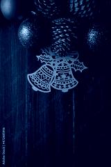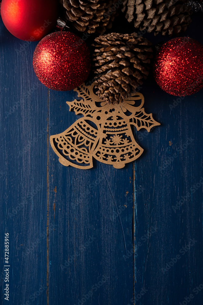 Pine cones and red christmas bells for christmas decoration on vintage blue wood background. Copy space for your text