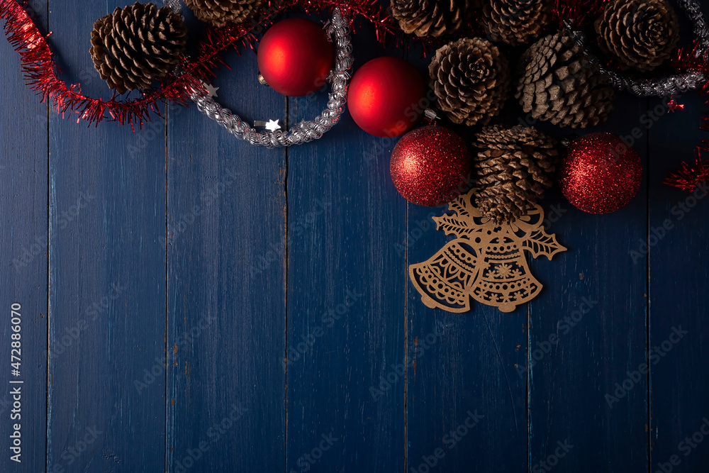 Pine cones and red christmas balls for christmas decoration on vintage blue wood background. Flat lay image with Copy space for your text