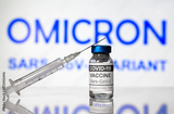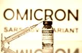 Omicron COVID-19 variant and corona virus vaccine, focus on vaccine bottle and syringe