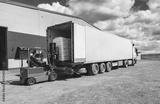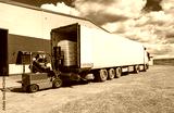 A man on a forklift works in a large warehouse, unloads bags of raw materials into a truck for transportation