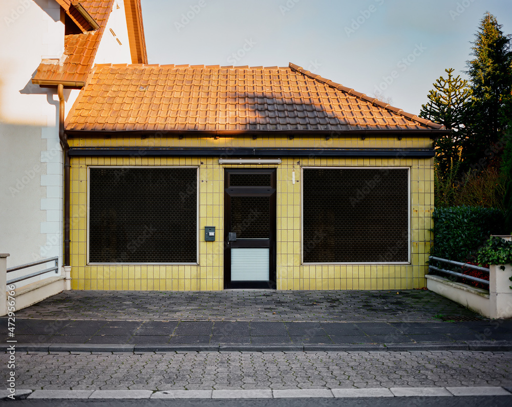 closed barber shop, closed and locked store front, impact of the coronavirus pandemic 2021.