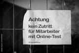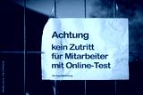 Schild am Zaun einer Firma. Achtung, kein Zutritt für Mitarbeiter mit Online Test