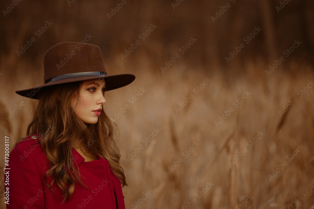 Elegant beautiful woman wearing trendy brown hat, red marsala color classic coat posing in nature. Outdoor autumn fashion close up profile portrait. Copy, empty space for text