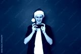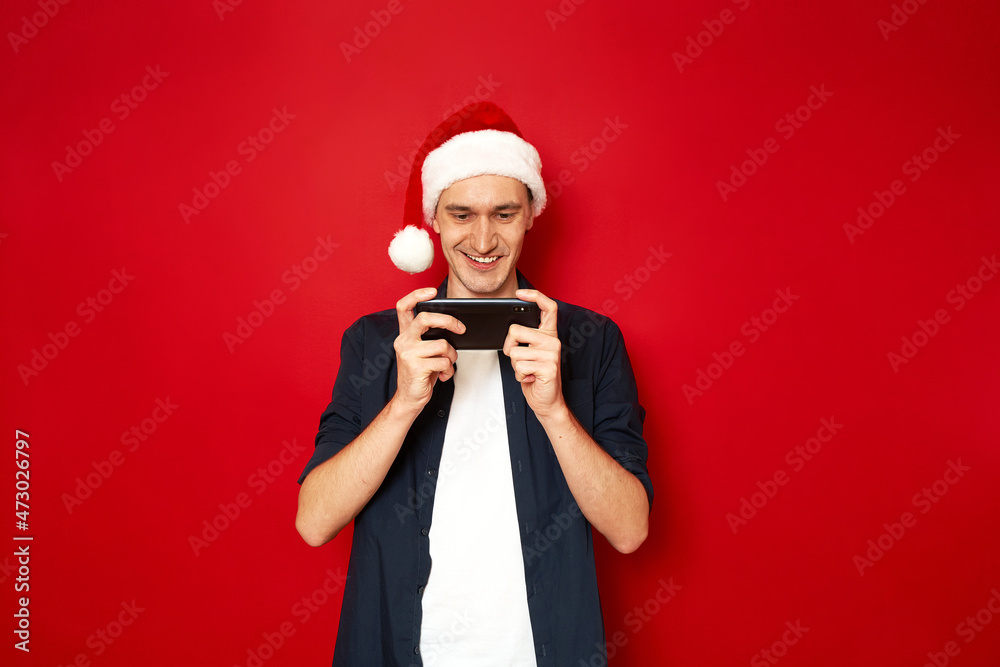 young man in casual clothes blue shirt New Year hat Santa Claus watching video on his phone playing mobile game in app highlighted with red background, concept - people, technology, entertainment